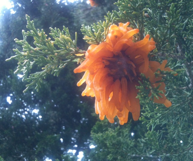 Gymnosporangium juniperi-virginianae fungi on an Eastern Red Cedar